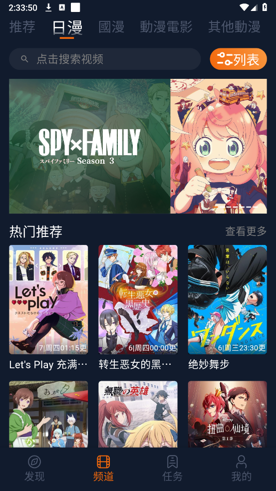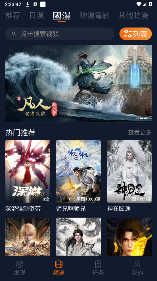 1、打开软件,在"频道"页面滑动选择所需下载的动漫资源。