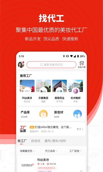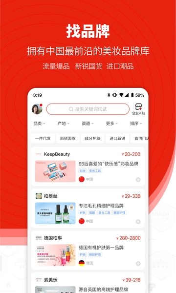 1、供需对接,领先的线上化妆品供需对接平台,化妆品行业的包打听,找品牌,找工厂,找加盟,深入化妆品产业链的各个环节,为您提供及时、高效、精准的匹配服务,更有专业的参谋团队,保姆式一键帮您对接,不再错过好商机