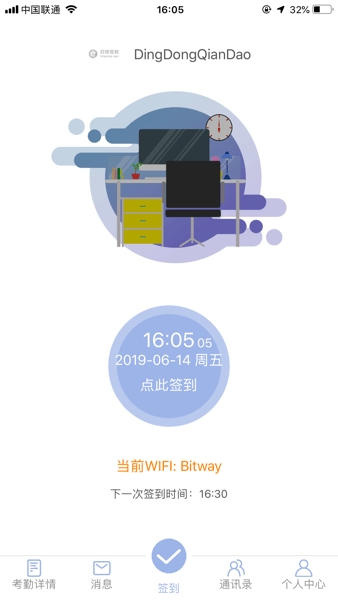 1、打开叮咚签到App后,默认进入签到首页界面,页面中央是一个醒目的绿色圆形区域,实时显示当前时间。如果您处于企业设定的考勤范围内(如绑定WiFi、指定位置),点击该绿色区域即可完成签到或签退。下方导航栏则包含“考勤详情”、“消息中心”等功能选项,可快速跳转至其他页面。