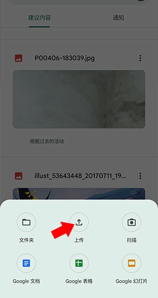 2、在打开的下方弹窗中选择选择【上传】选项并选择想要上传的文件即可