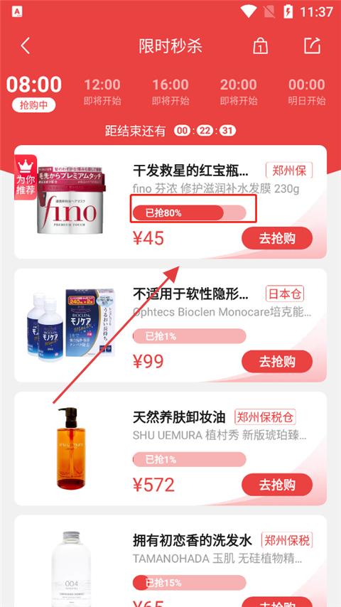 2、限时秒杀页按时段展示活动,商品标已抢进度、价格,去抢购按钮引导下单,让用户及时参与优惠,选购高性价比好物。