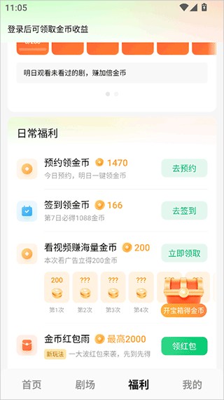 2、【金币福利】签到观看赚金币,一边看剧一边赚,提现秒到账。