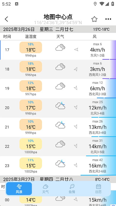 支持一周内天气查询和海况预报,直观并详尽地展示一天之内每隔1个小时的天气状况,包括温湿度、气压、降水量、风向、风力、浪高等内容。根据季节、日照时间、潮汐情况以及月相共同作用得出鱼类活动趋势,为用户的出行计划提供参考。