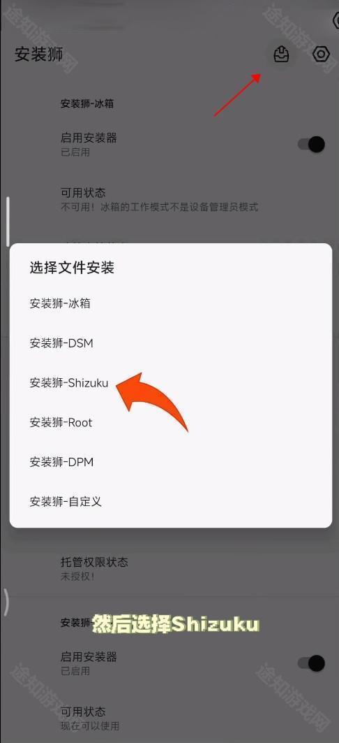 9、打开安装狮,点击右上角的安装,选择安装狮-Shizuku。