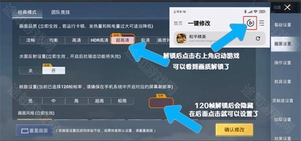 ②选择适合自己的帧率,教程图片里选择解锁所有画质和120帧率
