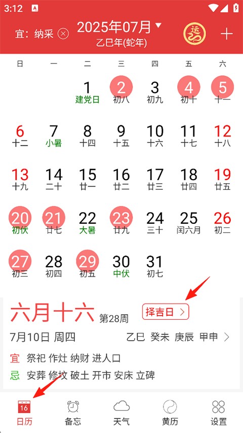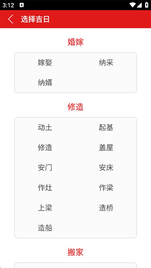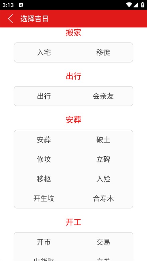 3、往下滑动还有搬家、出行、安葬以及开工等多个分类;