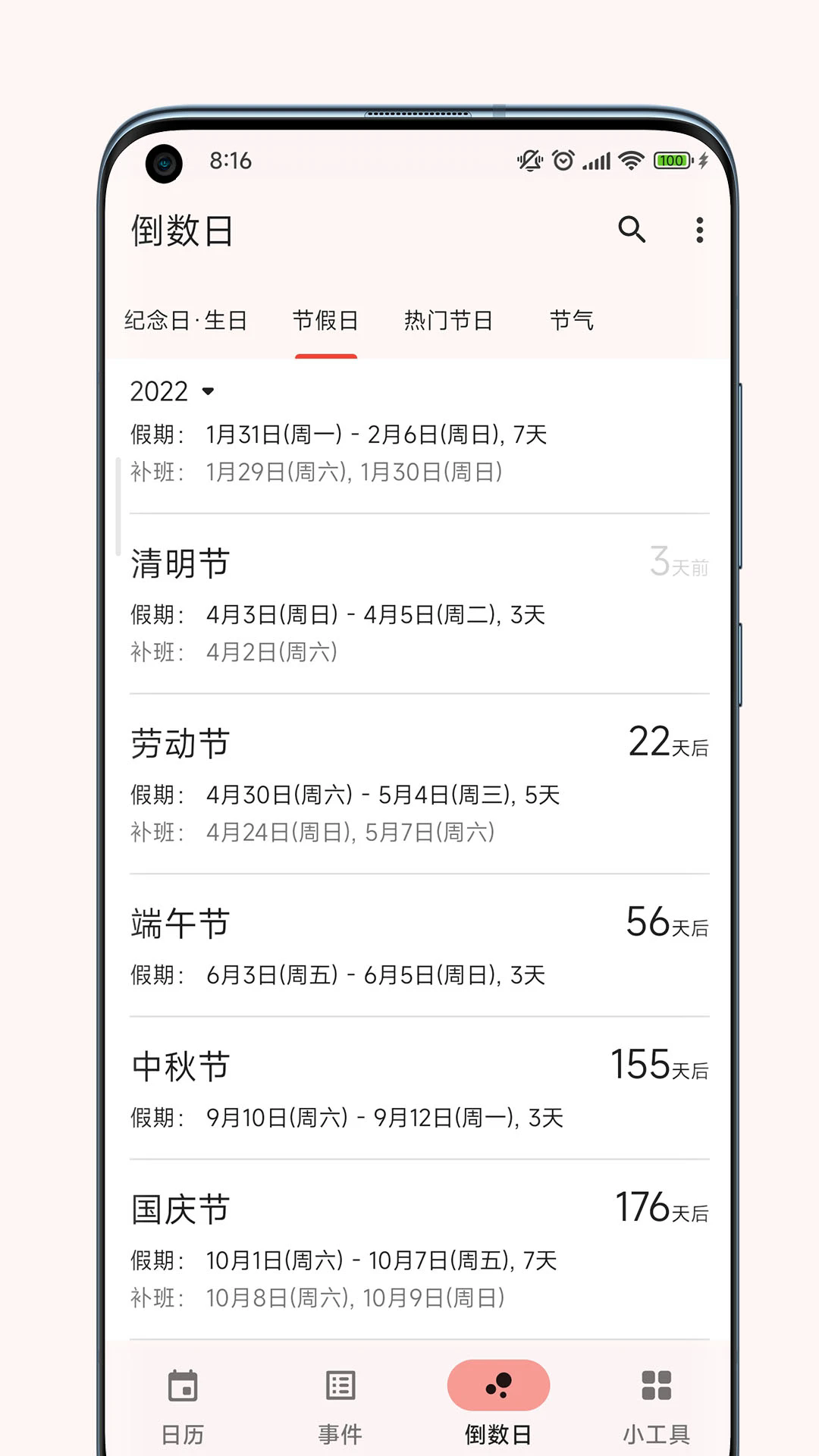 2、节日和节气:国内外传统节日和中国的二十四节气日期标注提醒,还有国家法定节假日上班时间调整,更有详细的科普介绍;