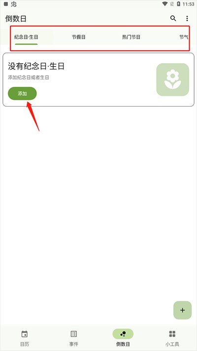 2、可以添加纪念日生日、节假日、热门节日之类的倒计时,然后点击添加;