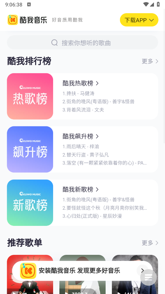 2、一键打开,主页涵盖多个音乐榜单资源,支持点击上方的搜索框搜歌。
