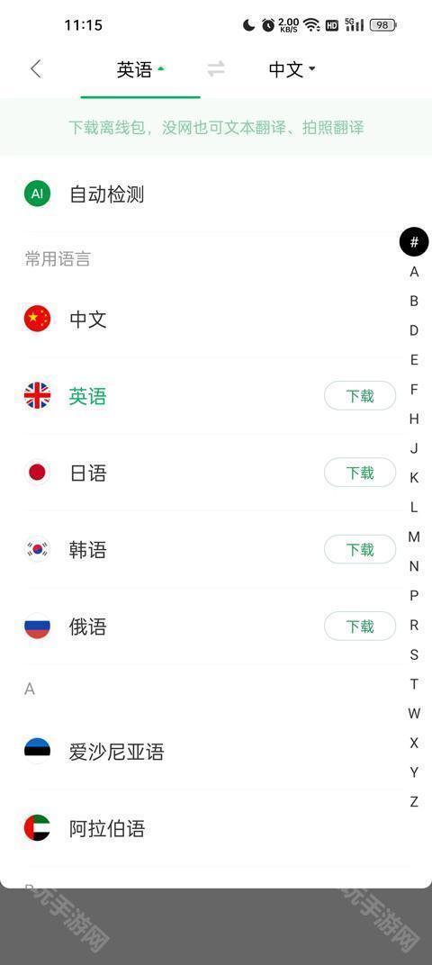 2、点击上图的功能进入到语言选择页面,选择你需要翻译的文字类型;