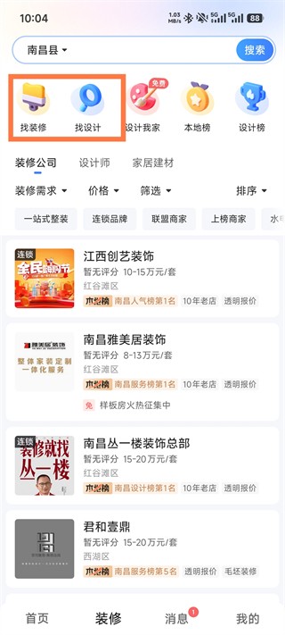 1、打开住小帮App,点击装修板块,上方会有【找装修、找设计、设计我家】等服务