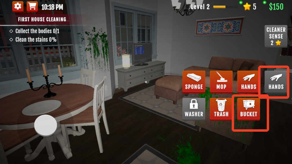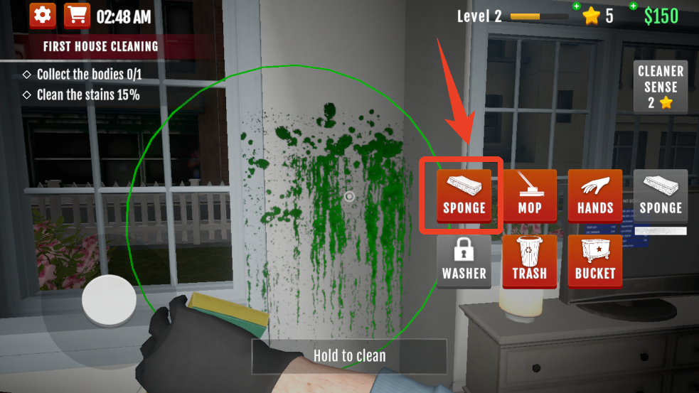 在选择好颜色后,需要拿起清理工具,包括海绵、水桶、拖把和垃圾桶,准备前往犯罪现场进行清理。