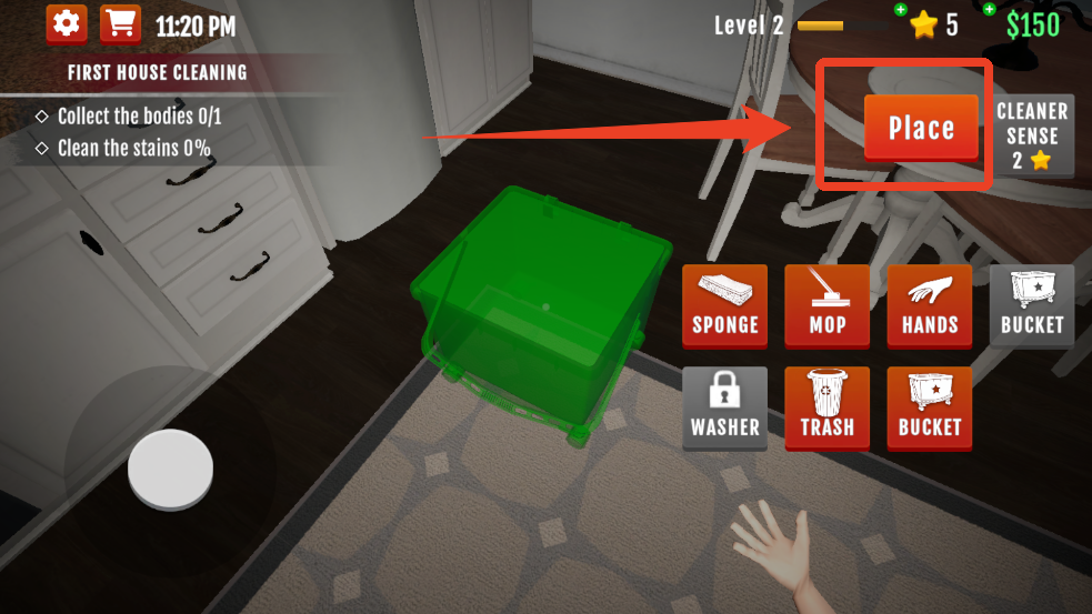 6、这时候我们点击【MOP】拿出拖把,将中间的光标对准地上的血迹,出现圆圈时,长按就能开始清理。
